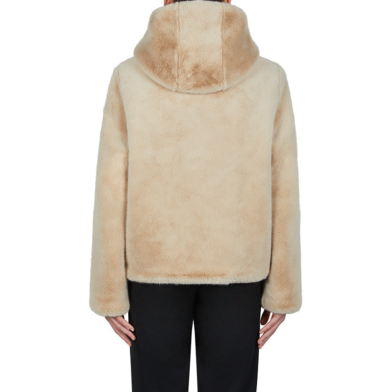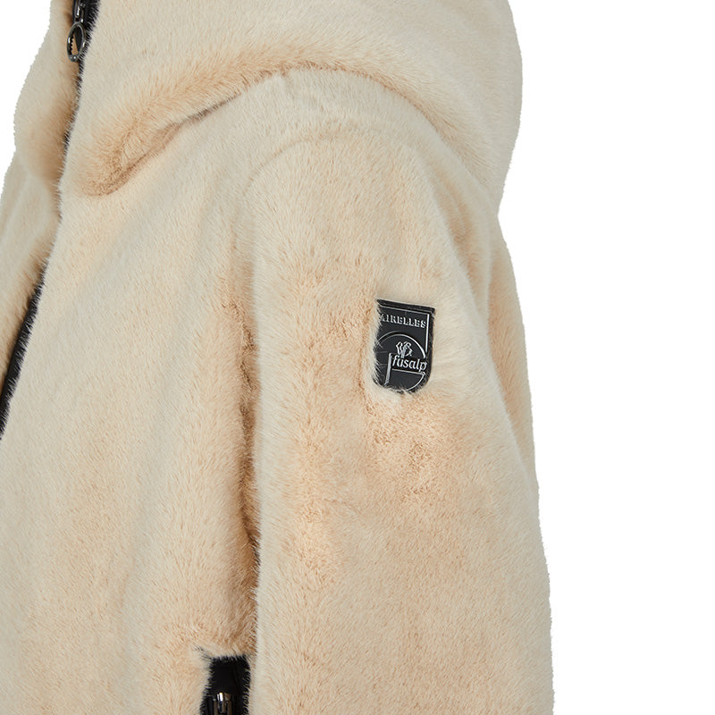 This chic and cosy thermal jacket features imitation downy fur, with latté-cream and black tones combining elegance and warmth.